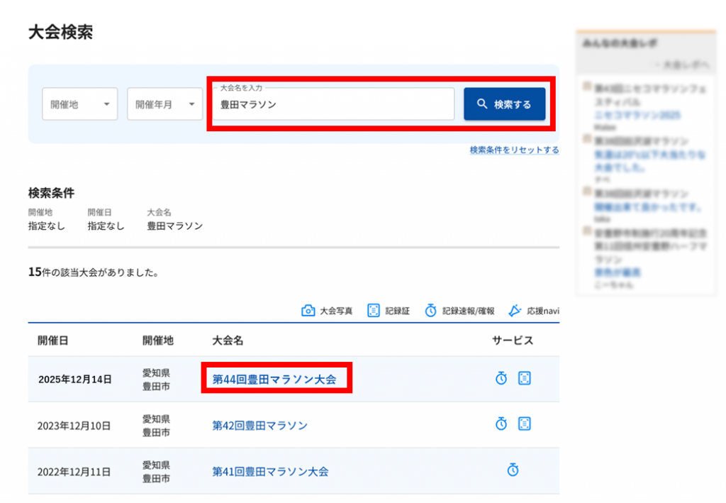 大会名で検索し「第44回豊田マラソン大会」を選択する |