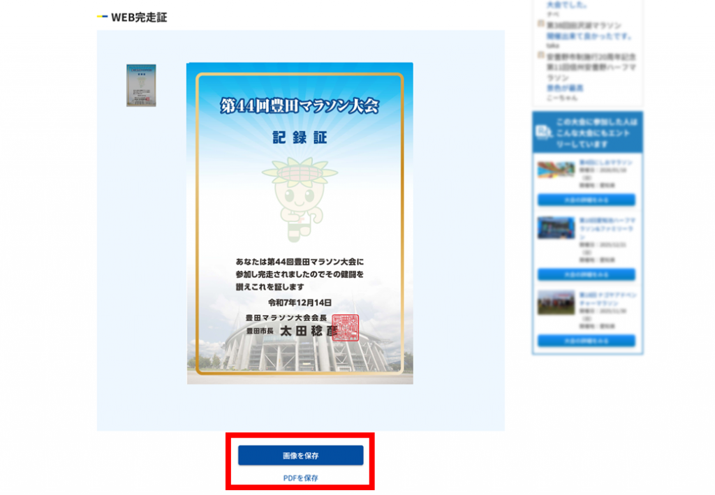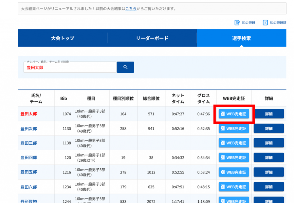 WEB完走証ボタンを選択する |