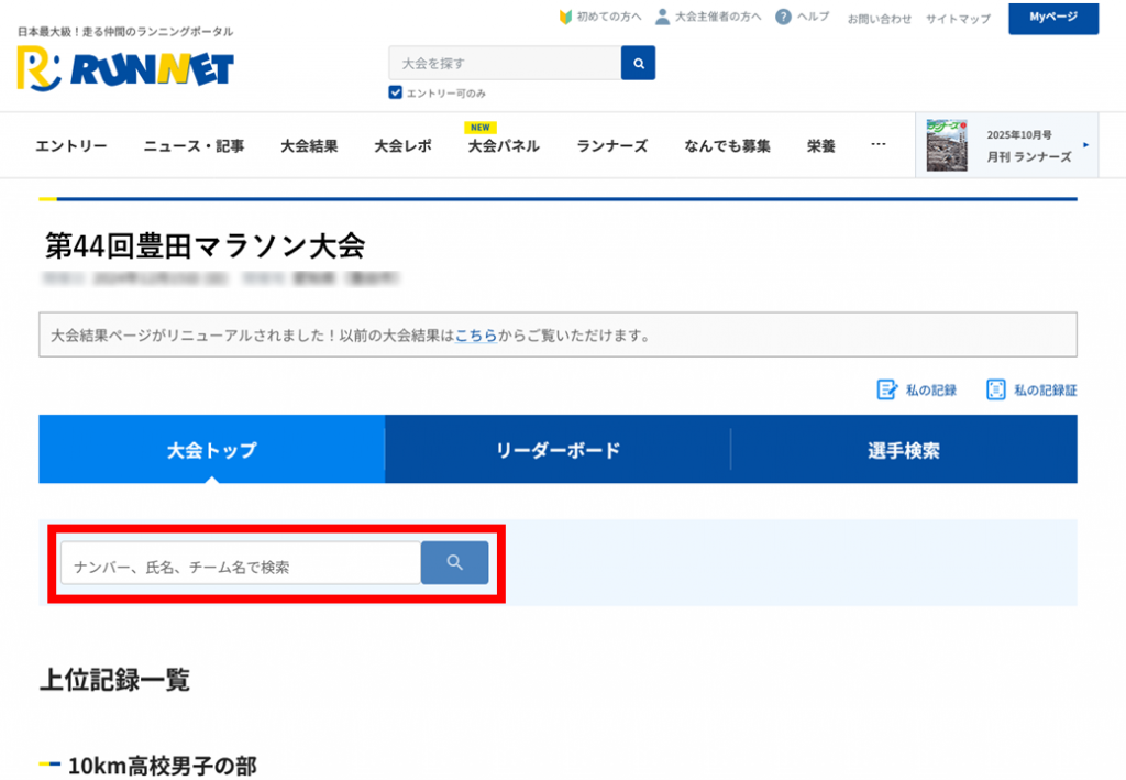 アスリートビブスナンバーまたは氏名で検索する |